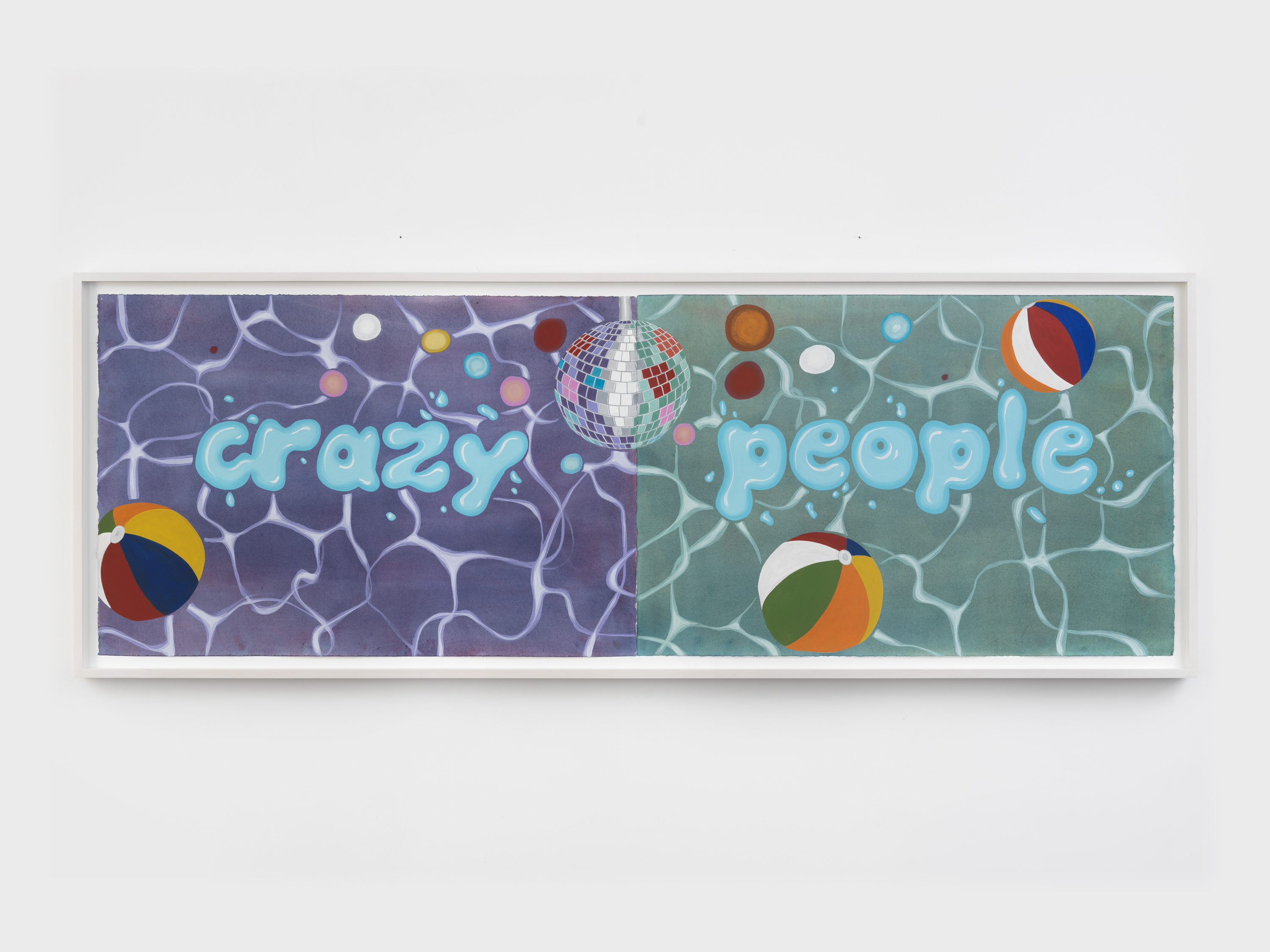 Untitled (Crazy People) showcases Mesler’s signature style of bold colors, stylized patterns, bright figuration, and unique calligraphic scripts. Referencing his childhood in California, the painting mixes humor, self-deprecation, and surprising compositional juxtaposition. Mesler’s polished works strengthen his connection to the legacy of Pop Art, and his use of text places him in a lineage of artists including Ed Ruscha and Christopher Wool.