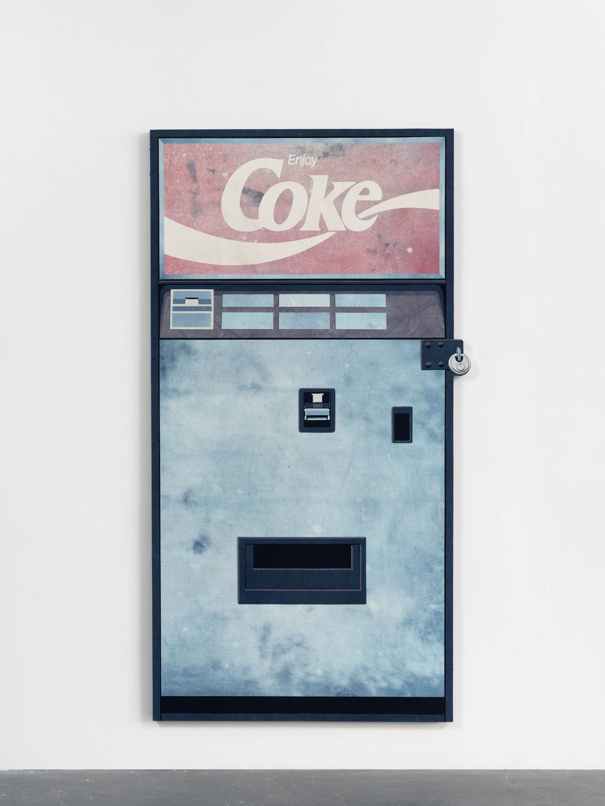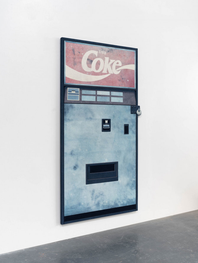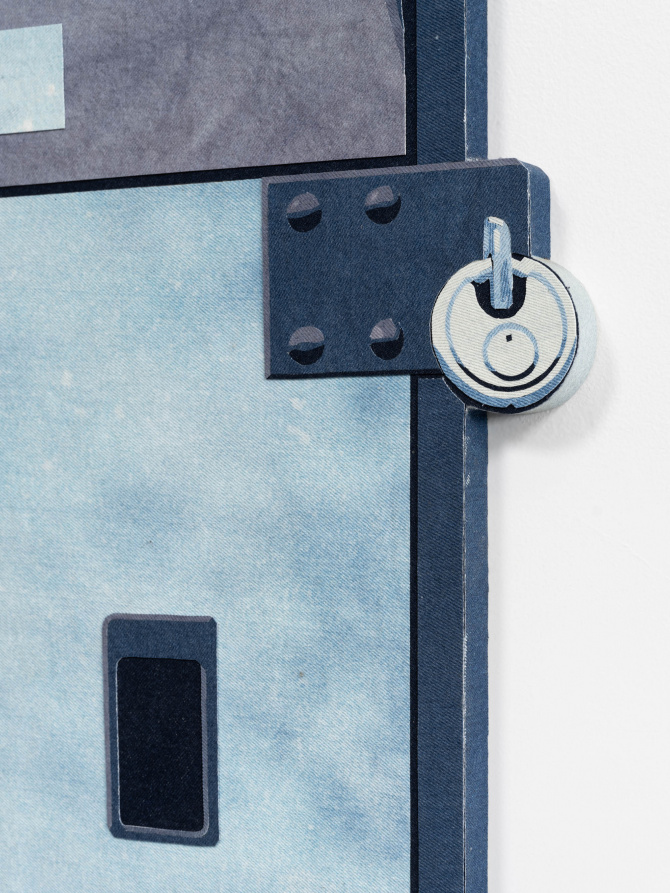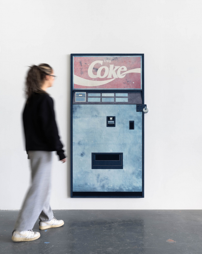 Nick Doyle is keenly aware of the legacy of the American notion of Manifest Destiny. Known best for sculptural wall works made from collaged denim, Doyle infiltrates the vocabulary of Americana to examine greed, excess, and toxic masculinity. Doyle uses the road trip—a pillar of American mythology—as a point of entry to his work in order to question the persistence of Rugged Individualism as the fabric of our national identity. Through a series of mechanical miniatures, theatrical scenery, and satirical prop-like denim works, the artist foregrounds the dangers of nostalgia and our evolving relationship to consumerism. Seemingly innocuous, Doyle’s imagery—vending machine, typewriter, cigarette pack—and materials—indigo and cotton—tell a story of American colonialism and consumerism, as well as explore the influence of media on global trade systems. By employing materials that hold cultural significance, the artist both reflects on and critiques social and political agendas that are often at play in contemporary life and visual culture.