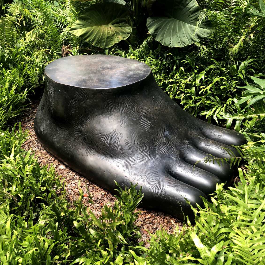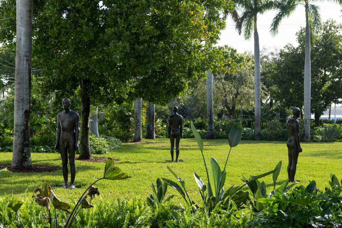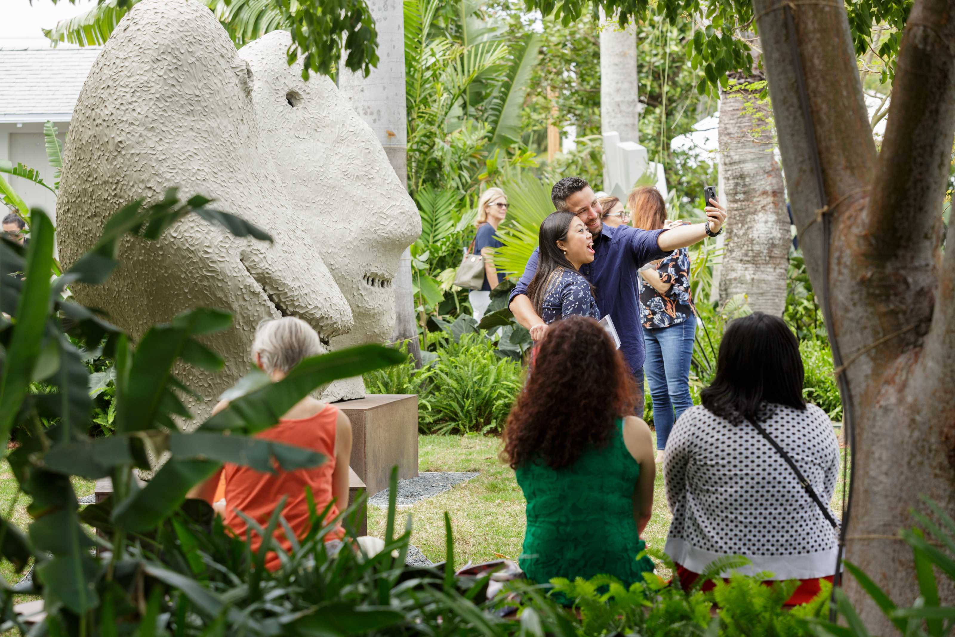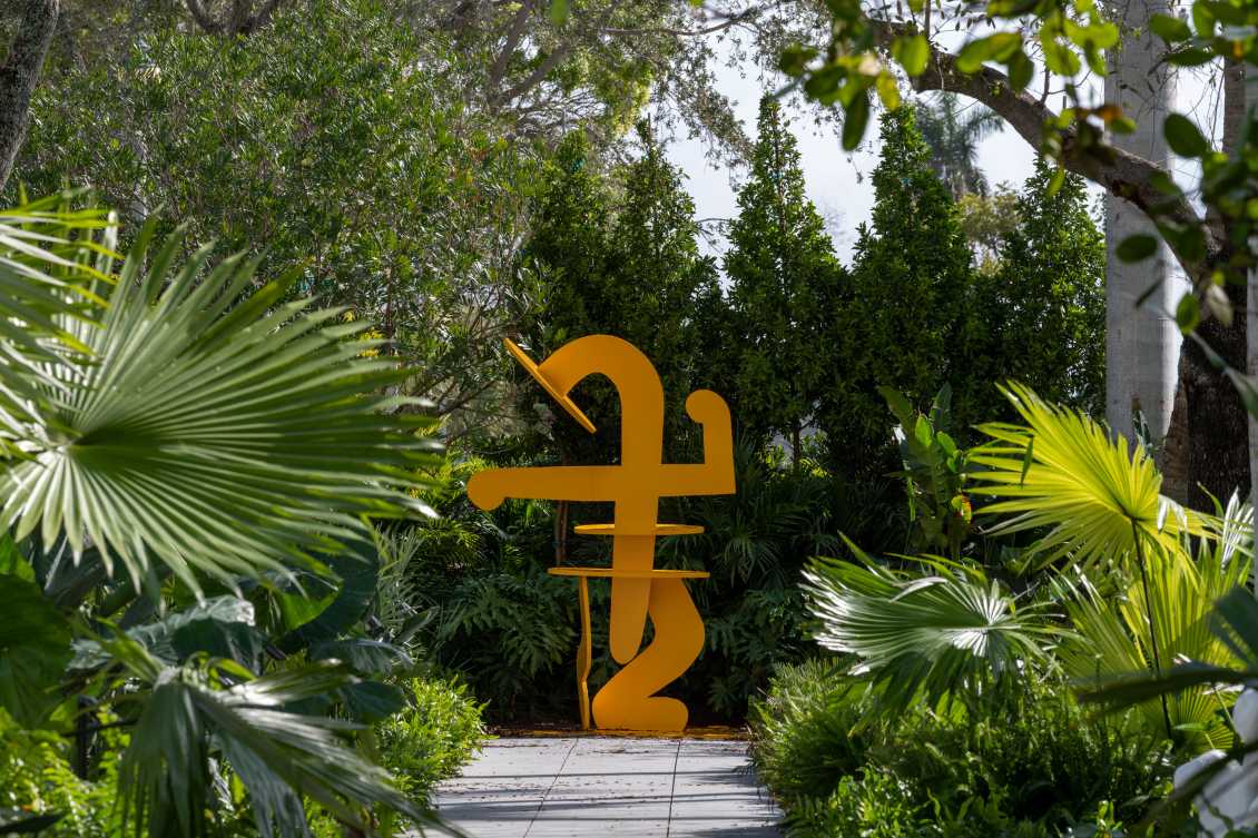 A rich layering of plants and trees creates a backdrop for displaying sculptural works. The introduction of mature trees creates instant shade that allows a rich mix of plants to thrive and form a cooling micro-climate for visitor comfort. Contrasting leaf sizes and shapes are accented with bright, tropical red and orange flowers such as Bird of Paradise and Heliconia. White-blooming flowers such as Jasmine, Plumeria, and Brugmansia provide attractive floral scents and visual interest in the cooler evenings for outdoor functions and events. Native trees attract birds and butterflies such as the Mangrove Skipper and Baltimore Oriole, providing visitors of all ages with educational and recreational opportunities.